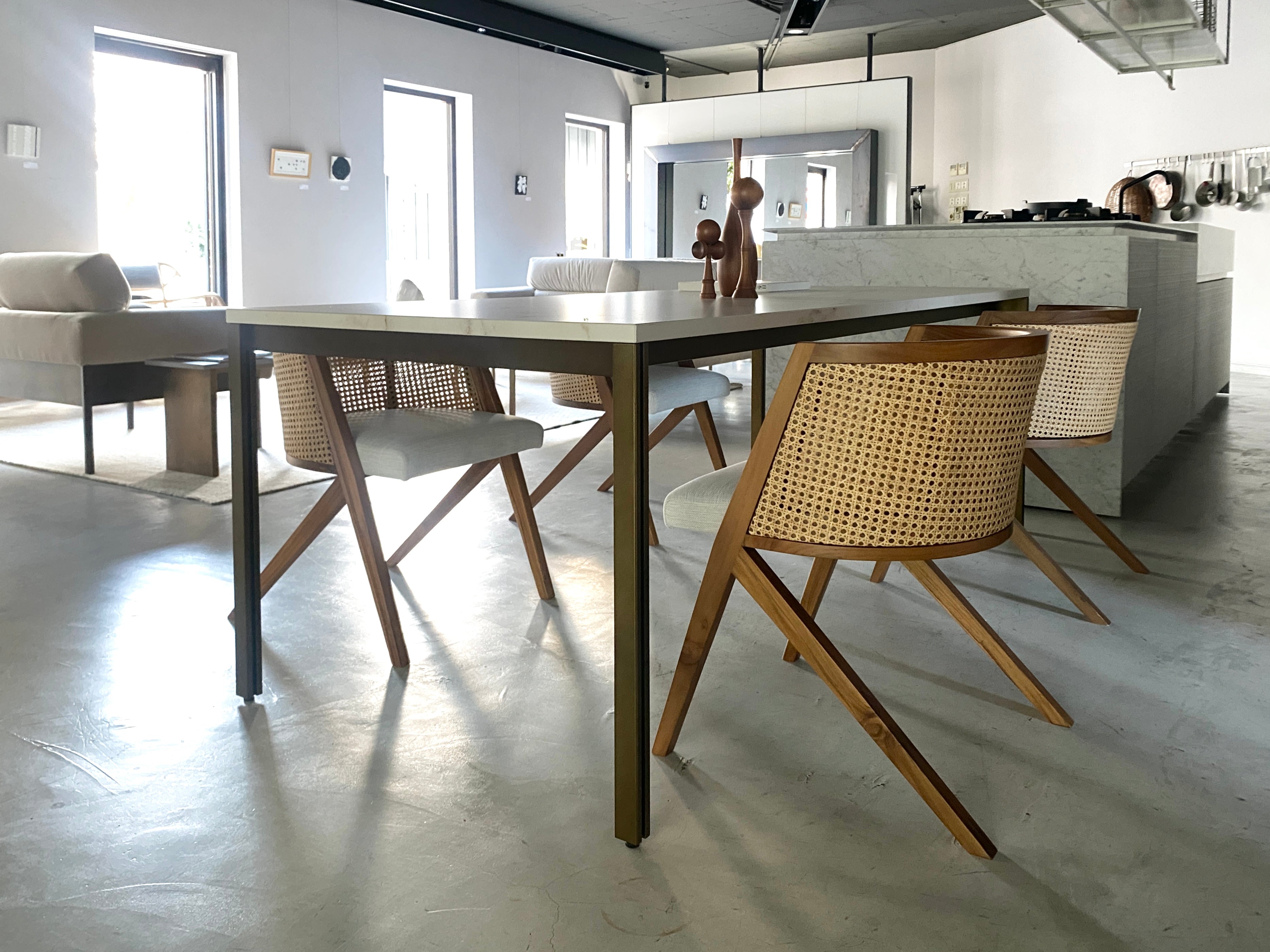 ダイニングテーブルであれば、古美色の脚部が構成の軸となり、その上にテーブルトップが取り合わされます。トップは空間に合わせてカラーを選べて、サイズオーダーもできる設計で、空間に合った“取り合わせ”を許容する。細い線でスパンを大きく飛ばしたプロポーションも、現代的な気分をそっと映し出しています。